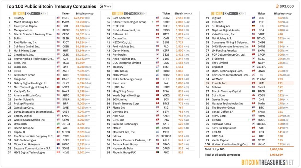 現在、約200社の上場企業が合計109万BTC以上を保有しており、評価額は約960億ドル、BTC総供給量の約5%に相当します。