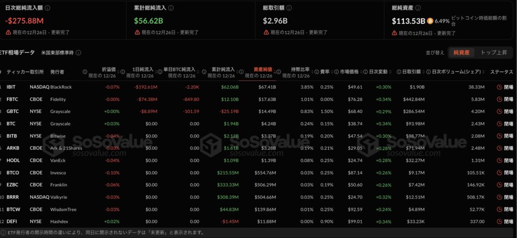SoSoValueのデータでは、12月26日(米国東部時間)時点で、ビットコインETF全体の日次純流出額は約2億7588万ドルとなっています。