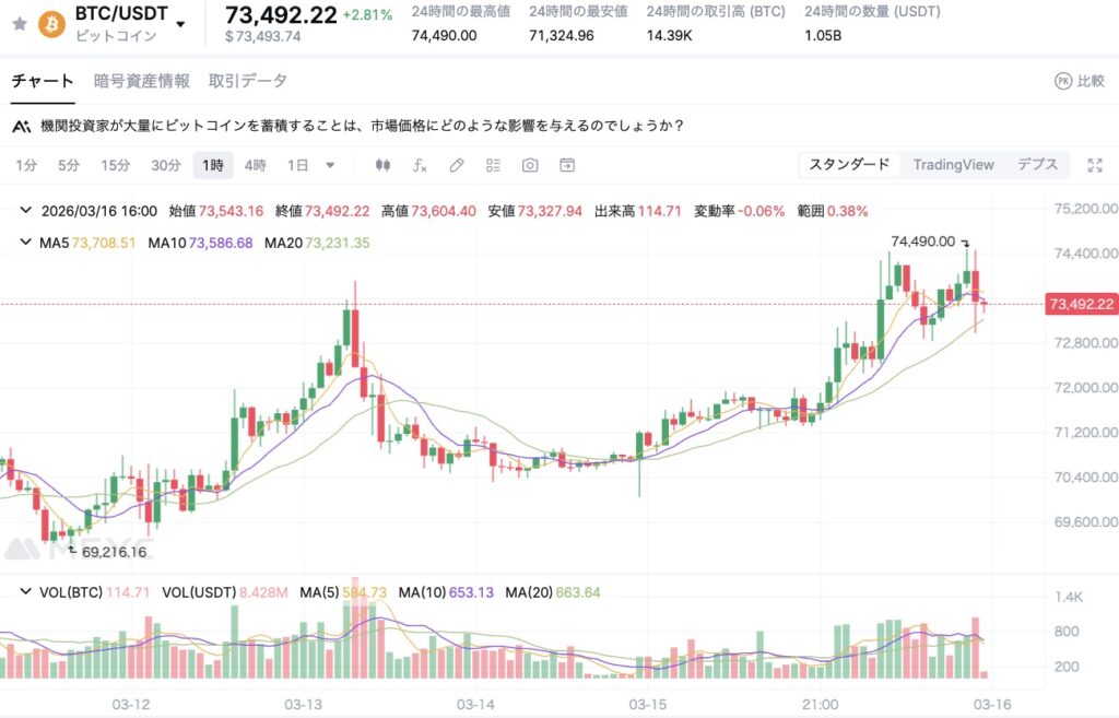 現在のビットコイン価格は約73,500ドル付近で推移しており、以下のような上昇を記録しています。