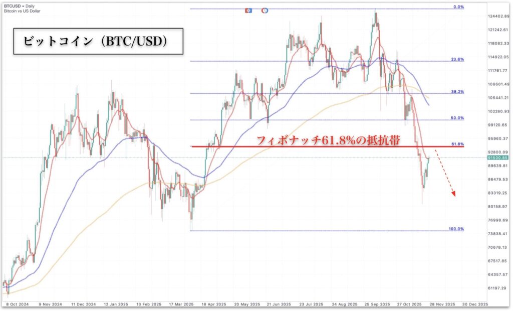 11月に入ってからの急落によって一時8万ドル台半ばまで値を崩したものの、足元ではショートカバーや押し目買いに支えられ、9万ドル台前半までやや持ち直しました。