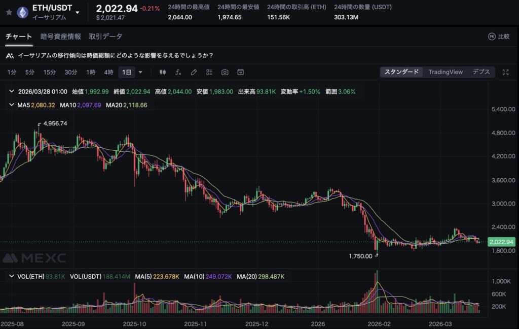 イーサリアム(ETH)は現在、長期的な下落トレンドからの明確な脱却に至っておらず、価格はETH=2,000ドル付近で不安定な推移が続いています。