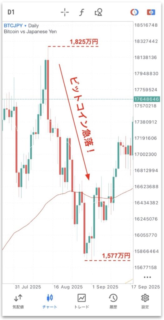 チャートを見ると、取引開始からビットコイン価格が約9.5%下落しており、現在の含み益はおよそ17,000円。