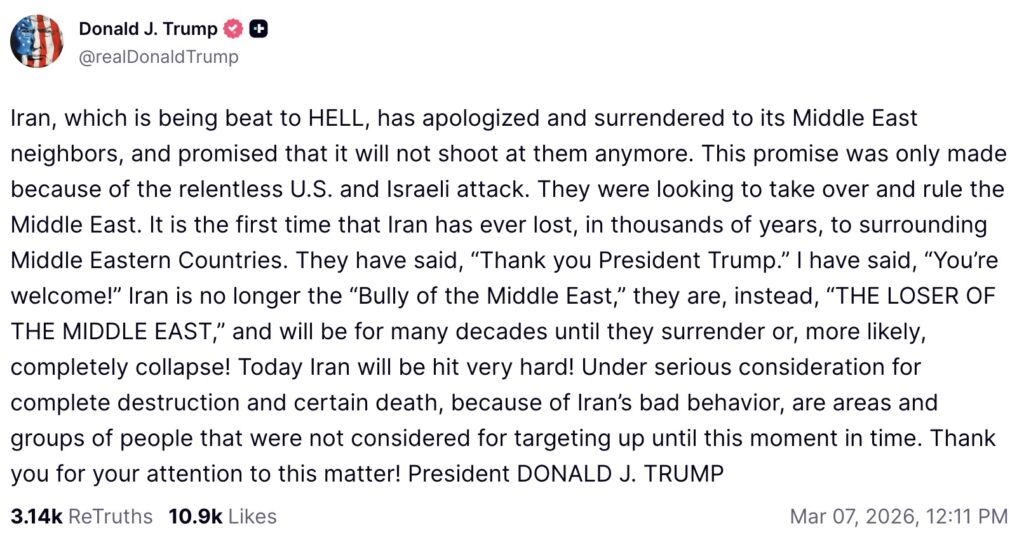 トランプ大統領はTruth Socialの投稿で、イランが中東の近隣諸国に謝罪し、これ以上攻撃を行わないことを約束したと主張しました。