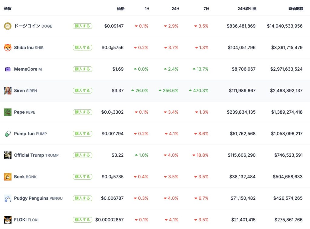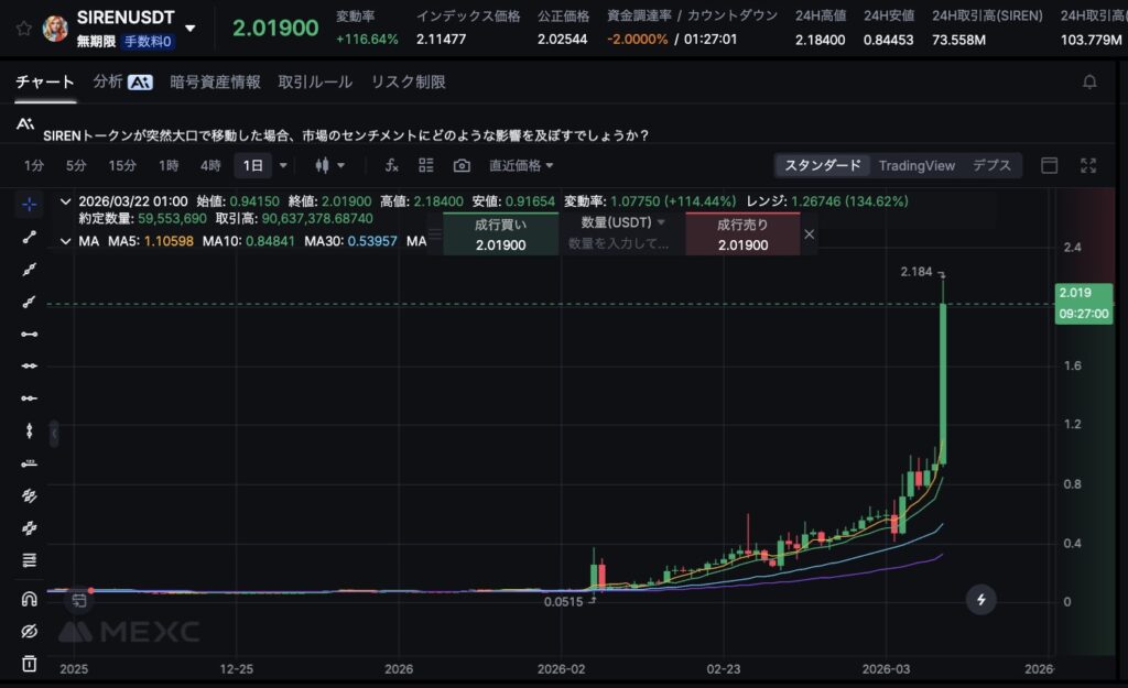 ミームコイン市場では、取引所対応や材料を契機に価格が一気に上昇する展開が頻発しており、SIRENも資金の集中によって急騰した構図です。