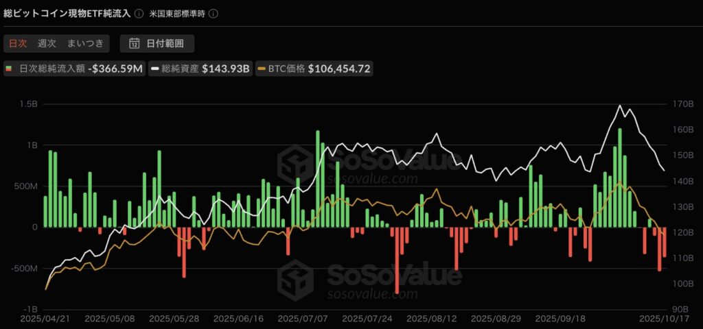 この影響でETF全体の累計純流入額は61.54億ドルまで減少し、9月末時点の62.7億ドルからおよそ2%減少。また、総資産純値も1,439億ドルへと縮小し、ETF市場全体で一時的なリスク回避姿勢が強まっています。