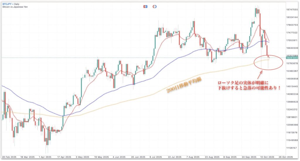この場合、ビットコインは200日線を明確に割り込み、約94,000ドル(約1500万円)を目指して下落する展開が予想されます。特に、ローソク足の実体が200日線を下抜けるとテクニカル的な売り圧力が強まり、短期的な急落の可能性にも警戒が必要です。