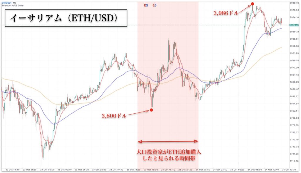 注目すべきは、オンチェーンデータに記録された大口投資家によるETH追加購入のタイミングと、価格反発の動きがほぼ一致している点です。